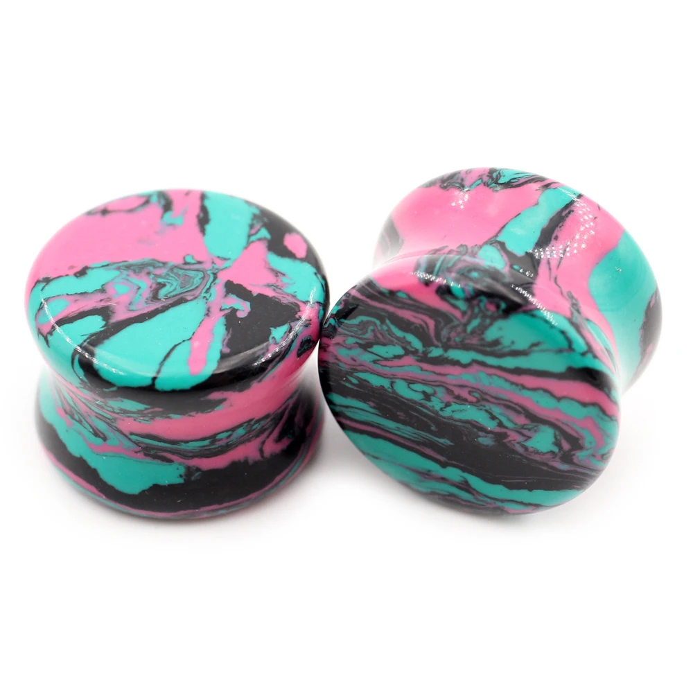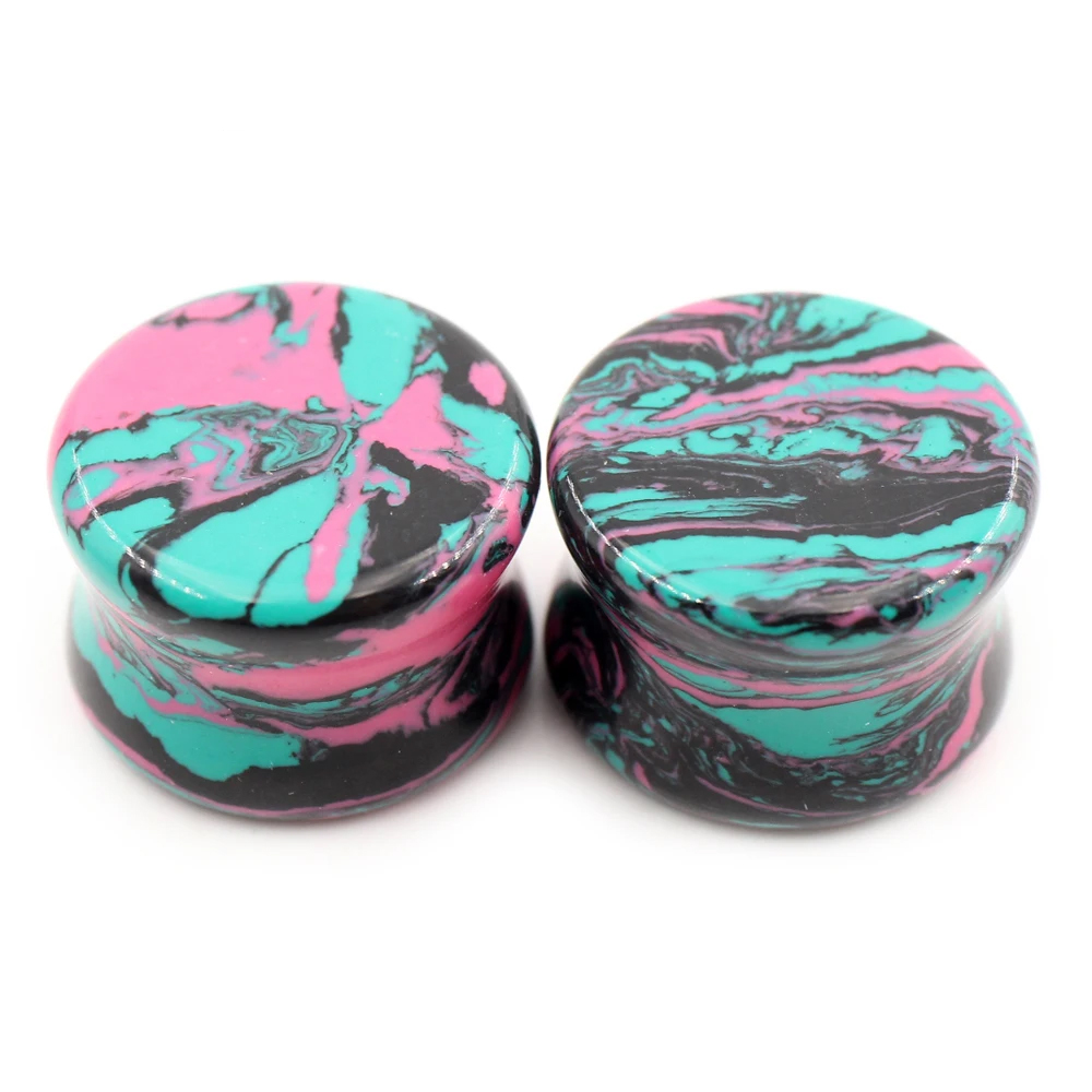 グリーンとピンクの綺麗な色合いが混ざり合ったダブルフレア型の天然石ボディピアス。